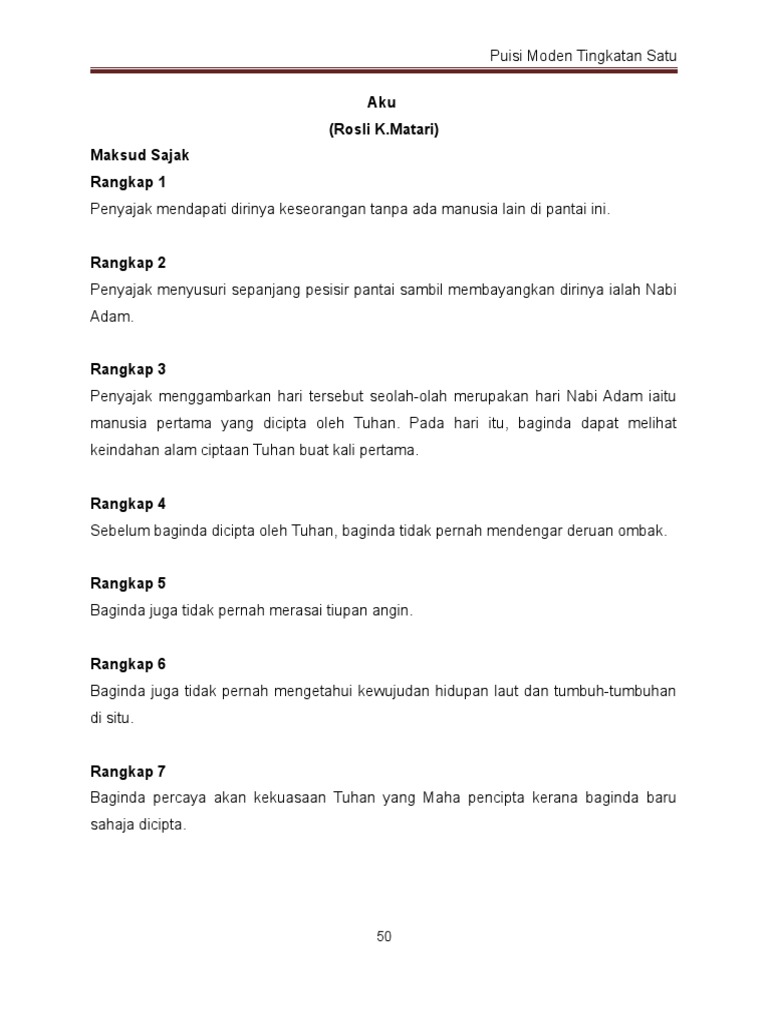Aku Rosli KMatari Maksud Sajak Rangkap 1 Penyajak mendapati dirinya keseorangan tanpa ada manusia lain di pantai ini. Sajak aku membaca lagi Tingkatan 4 por HARZ. Tidak ada manusia lain Tidak terasa olehku di pantai ini sentuhan angin ini kecuali diriku bertiup di mana-mana Kususur.