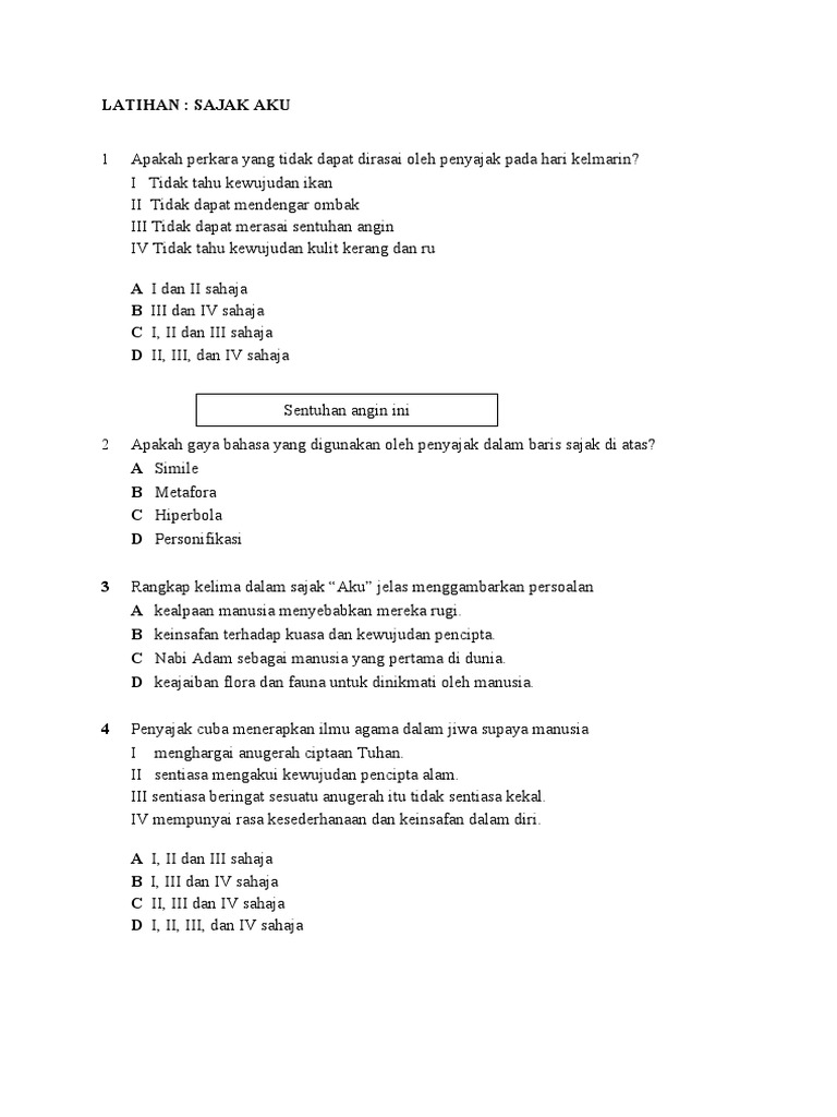1 Sajak AKU mempunyai berapa rangkap a 5 b 6 c 7 d 8 2 Sajak ini berbentuk a bebas b terikat c tersusun d sama 3. Muat turun halaman 1-9 di AnyFlip. Preview this quiz on Quizizz.